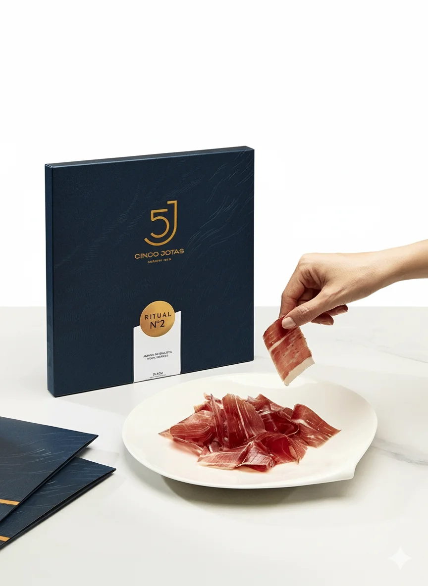 Consejos para una degustación perfecta: Para vivir la experiencia Cinco Jotas al máximo, saca el sobre de la nevera unos 20 minutos antes de consumirlo. Puedes sumergirlo unos segundos en agua tibia para que las lonchas se separen con facilidad. Ábrelo, extiende las lonchas en un plato y déjalas reposar a temperatura ambiente (20-24ºC). Verás cómo el jamón «suda», liberando sus aromas y brillos, indicando que está listo para ser disfrutado.
