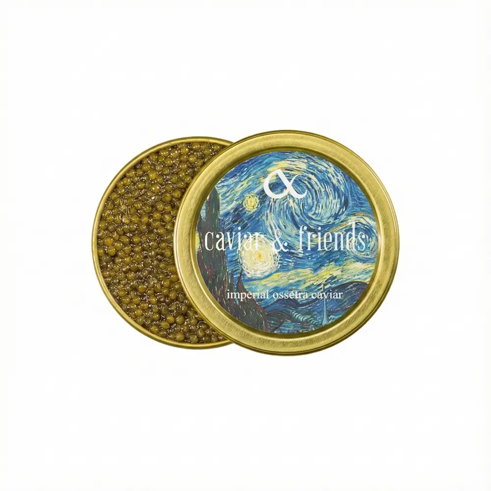 Si buscas comprar caviar online que represente la cúspide de la elegancia, la edición «The Star» es la respuesta definitiva. Bajo la icónica imagen de La Noche Estrellada de Van Gogh, Caviar & Friends presenta su mejor Osetra Imperial. A diferencia de otras variedades, este producto garantiza una pureza absoluta: cada lata proviene de un único pez (Acipenser gueldenstaedtii), sin mezclas de lotes, asegurando una uniformidad de color y sabor que solo los paladares más entrenados saben valorar.