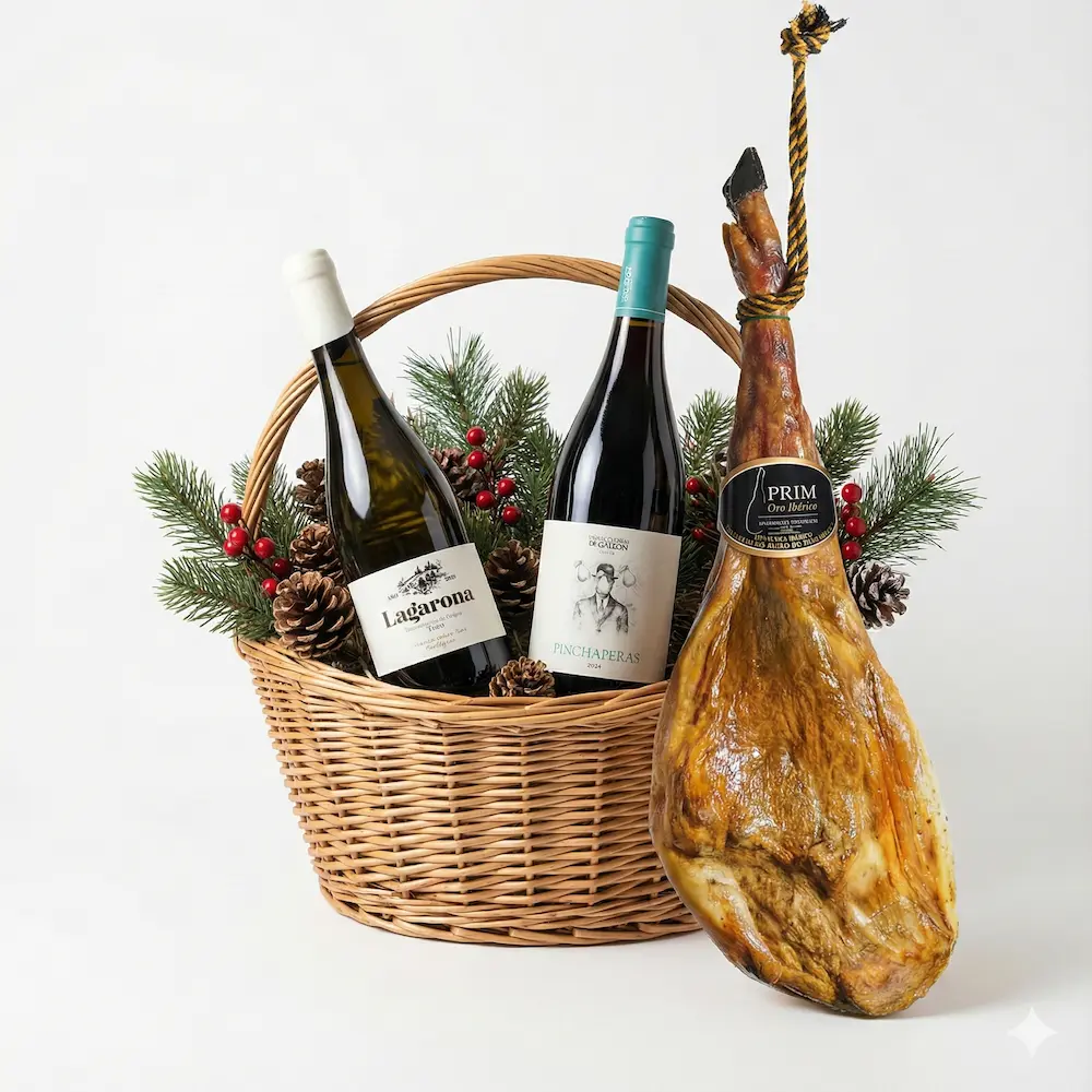 Esta Cesta de Navidad Gourmet es el regalo definitivo para estas fiestas: una pieza entera de Jamón de Cebo Ibérico 50% Raza Ibérica Prim, acompañada de dos vinos de la prestigiosa D.O. Toro (Bodegas Piedra). Es la combinación perfecta para disfrutar del maridaje clásico (tinto) y el moderno (blanco) en una sola compra.