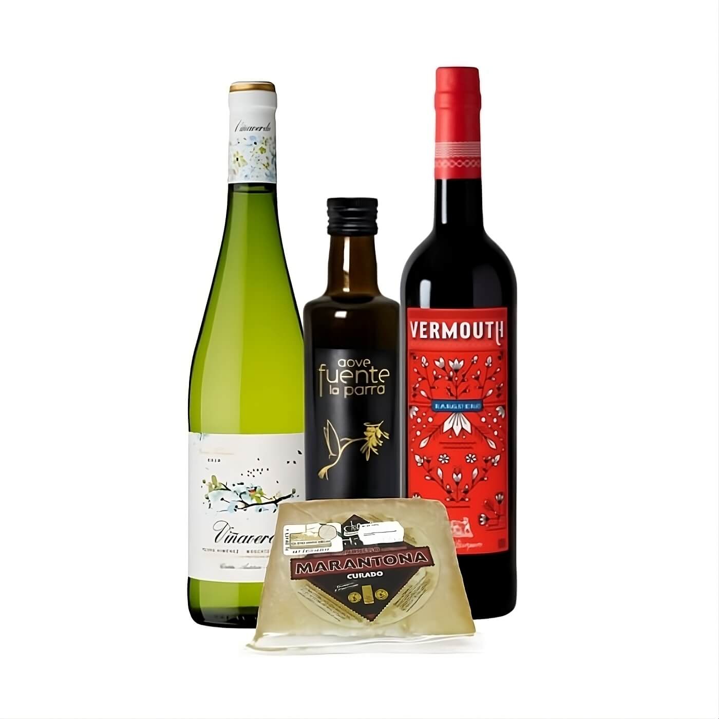 Regala este lote gourmet que contiene 2 botellas de vino (vino blanco y vermú), AOVE y queso para un maridaje exclusivo. Presentado en elegante caja lista para disfrutar o regalar a quién desees.
