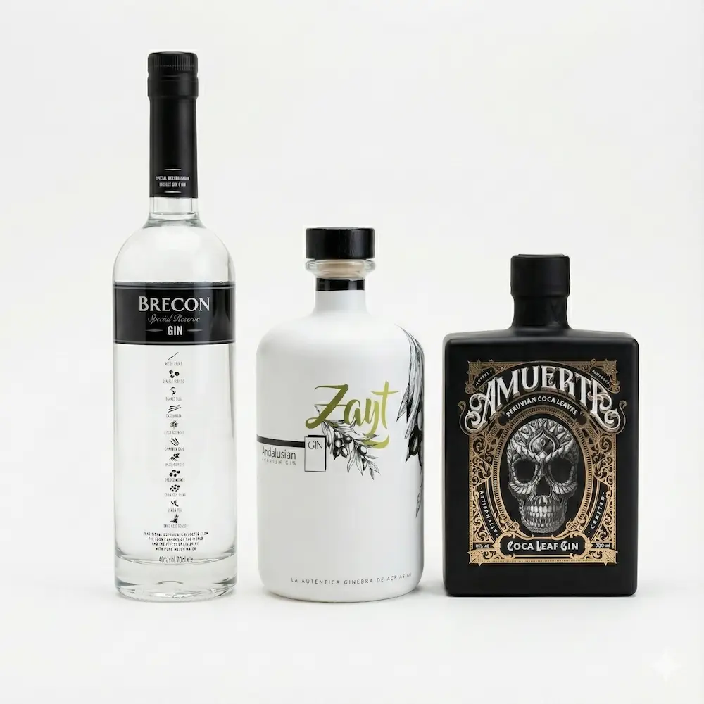 Zayt Gin Premium (España): La innovación con sello andaluz. Zayt es la primera ginebra del mundo asociada directamente al olivar. No sabe a aceite, pero utiliza la aceituna como botánico principal, lo que le confiere una textura sedosa, casi oleosa, y un recuerdo a hierba fresca y campo que no tiene ninguna otra. Su botella blanca de cerámica protege el líquido de la luz y queda preciosa en cualquier estantería.